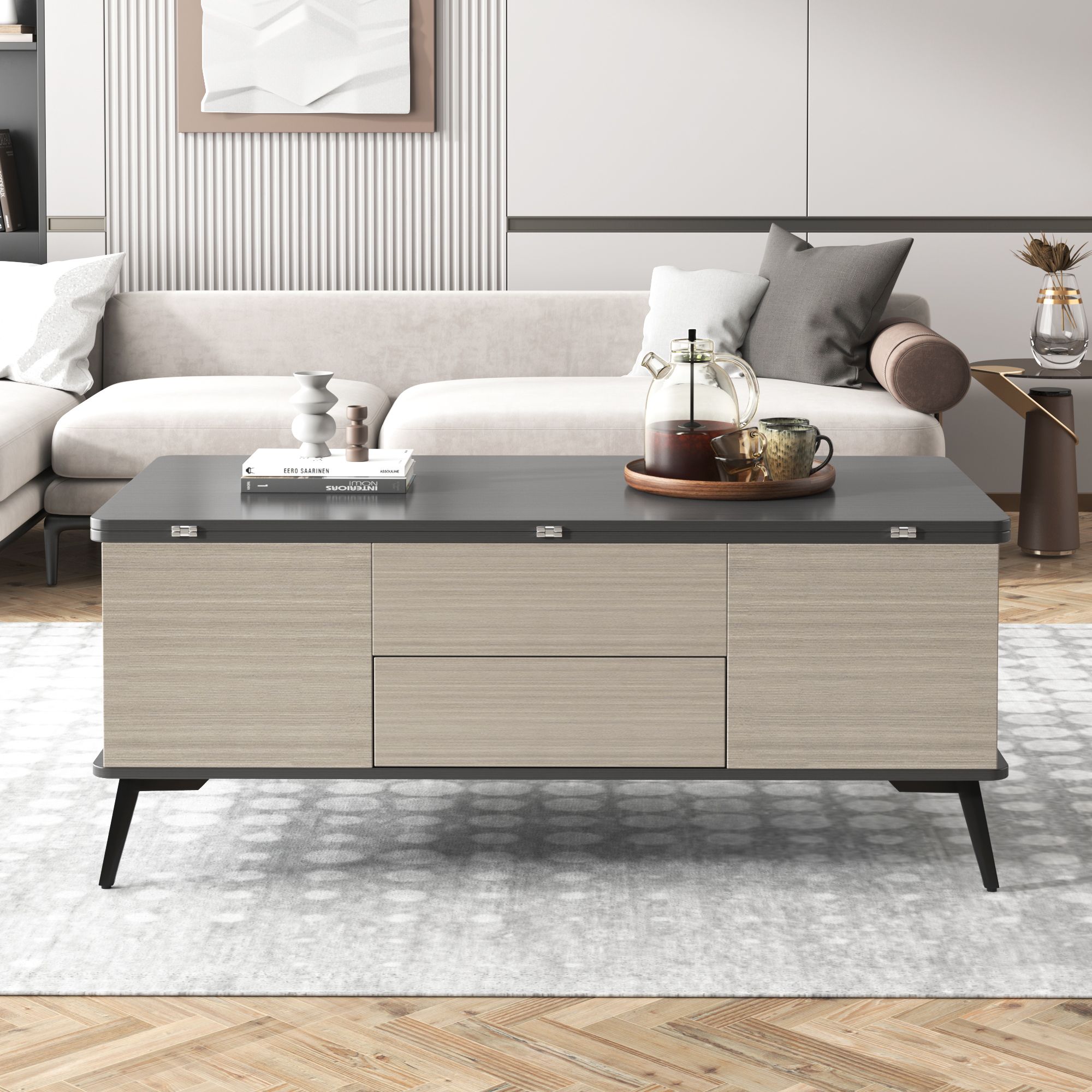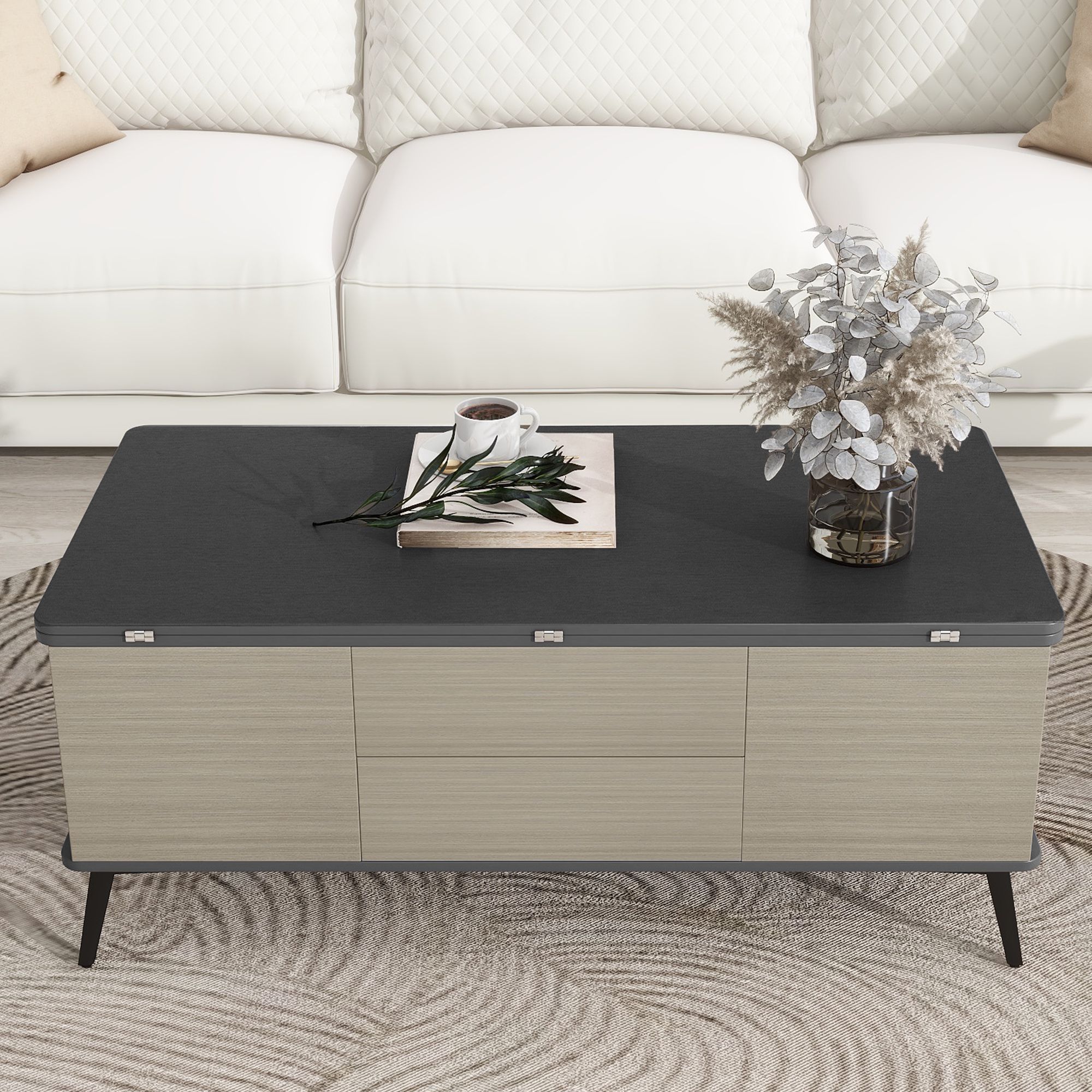 1.Lift-Top Coffee Table: The centerpiece of the set is a coffee table made from MDF (Medium Density Fiberboard) material. It is designed with a lift-top mechanism, allowing you to easily raise the table's surface to a comfortable height for dining, working, or other activities. The lift-top feature is operated through a hydraulic system, ensuring smooth and effortless lifting.