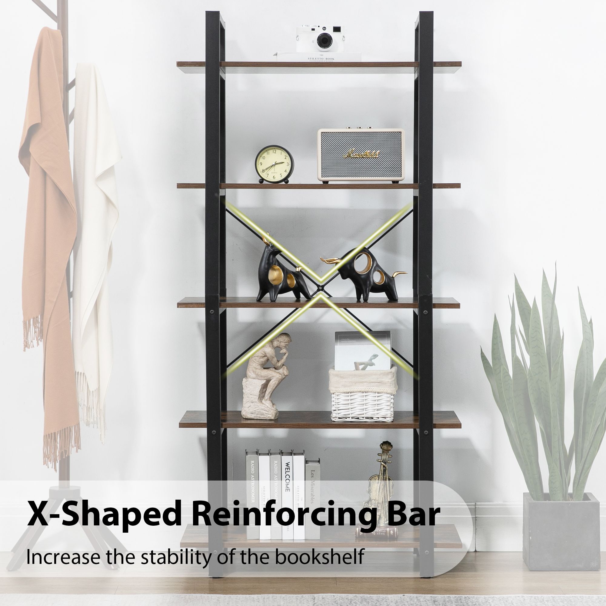 3.Sturdy Construction: High level material of MDF, wood grain PVC and Square Steel Tube Frame ensure the large 5 shelf bookcase years of use.