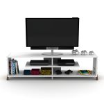 The mid century modern design of this wooden TV Stand will change the mood in your living rooms. High quality melamine coated chipboard and wooden cross legs combine to bring elegance to your living rooms. 4 shelves under the unit provides huge space your media entertainment and books. Cable management is also available to easily connect your devices to your television. With the color alternatives and elegant design it is suitable for every room. All of our products are being manufactured with ultimate care and ensured to be quality checked for best customer experience and satisfaction. Dimensions: 57" W 15" H 12" D