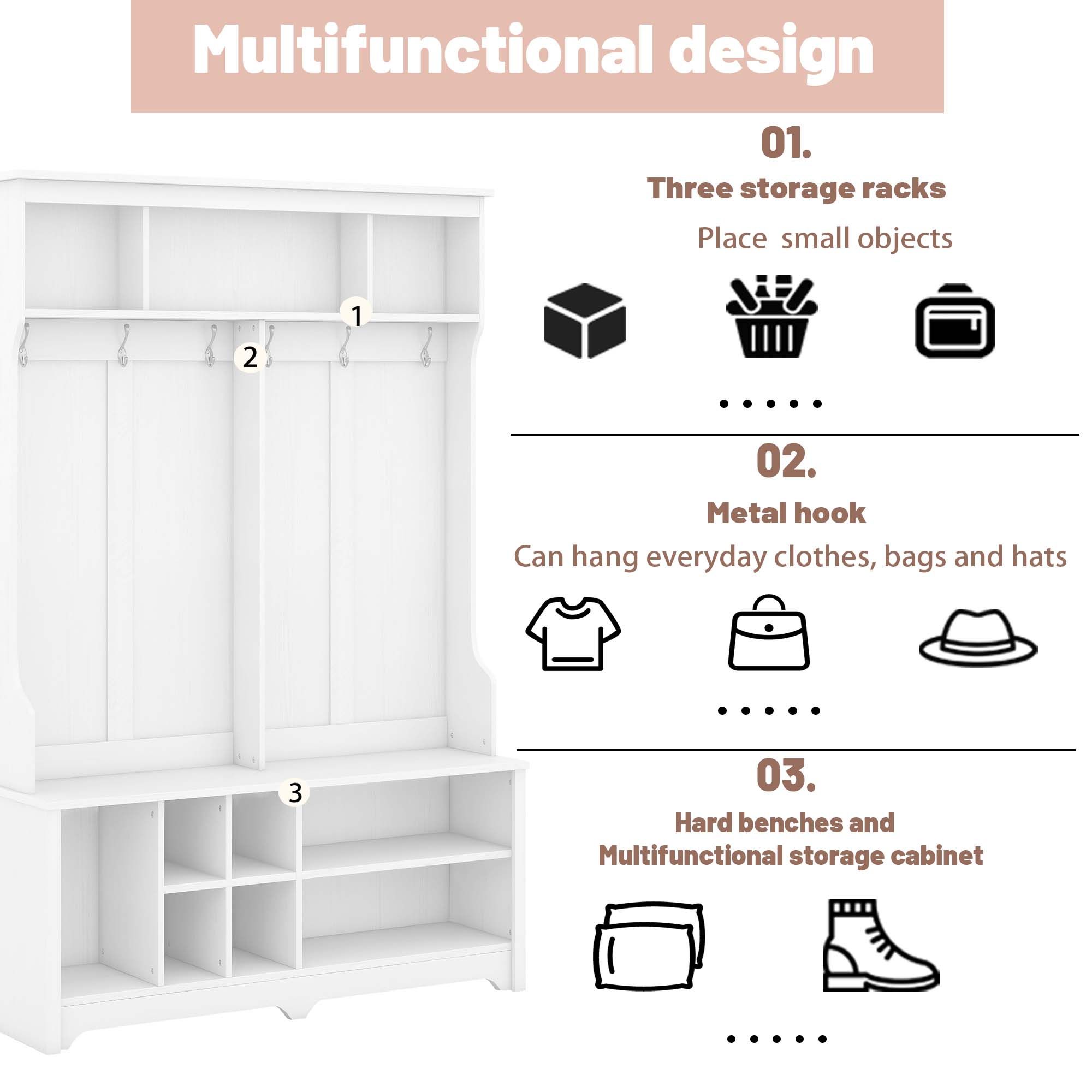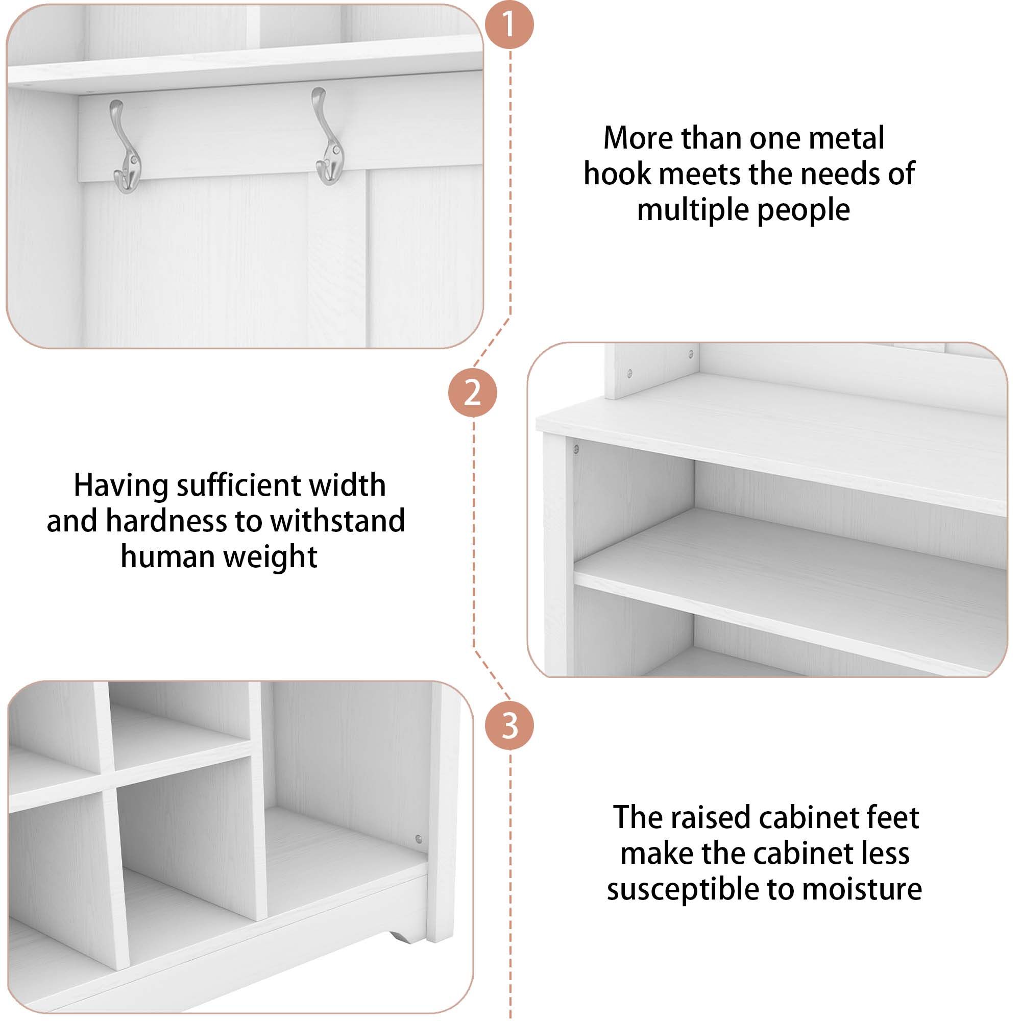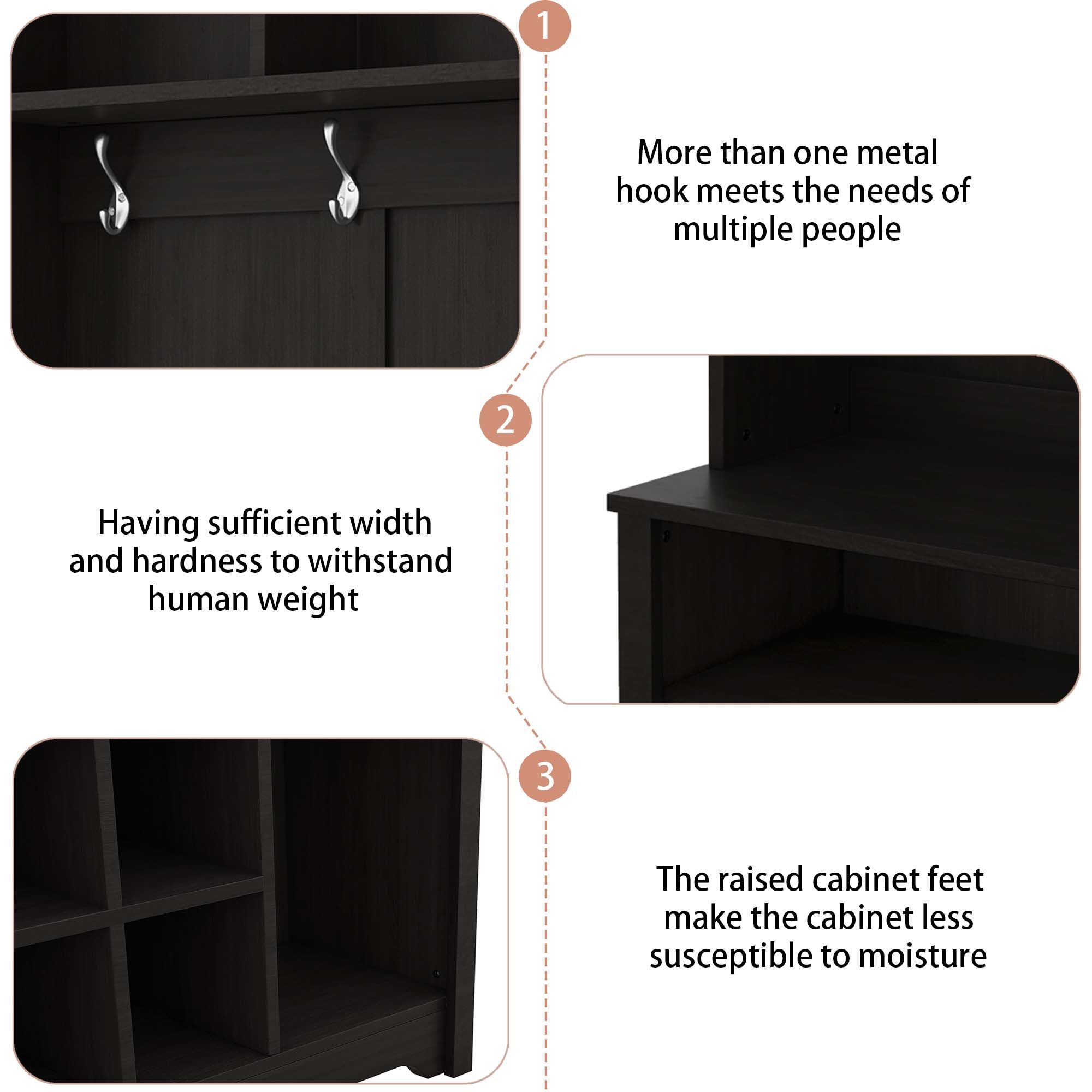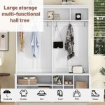 Available in black and white, offer different choices according to your preference or house style. Multi-functional hall tree, with different storage functions to meet different needs. Quality materials ensure stability and durability. The anti-dumping device ensures the safety of use.