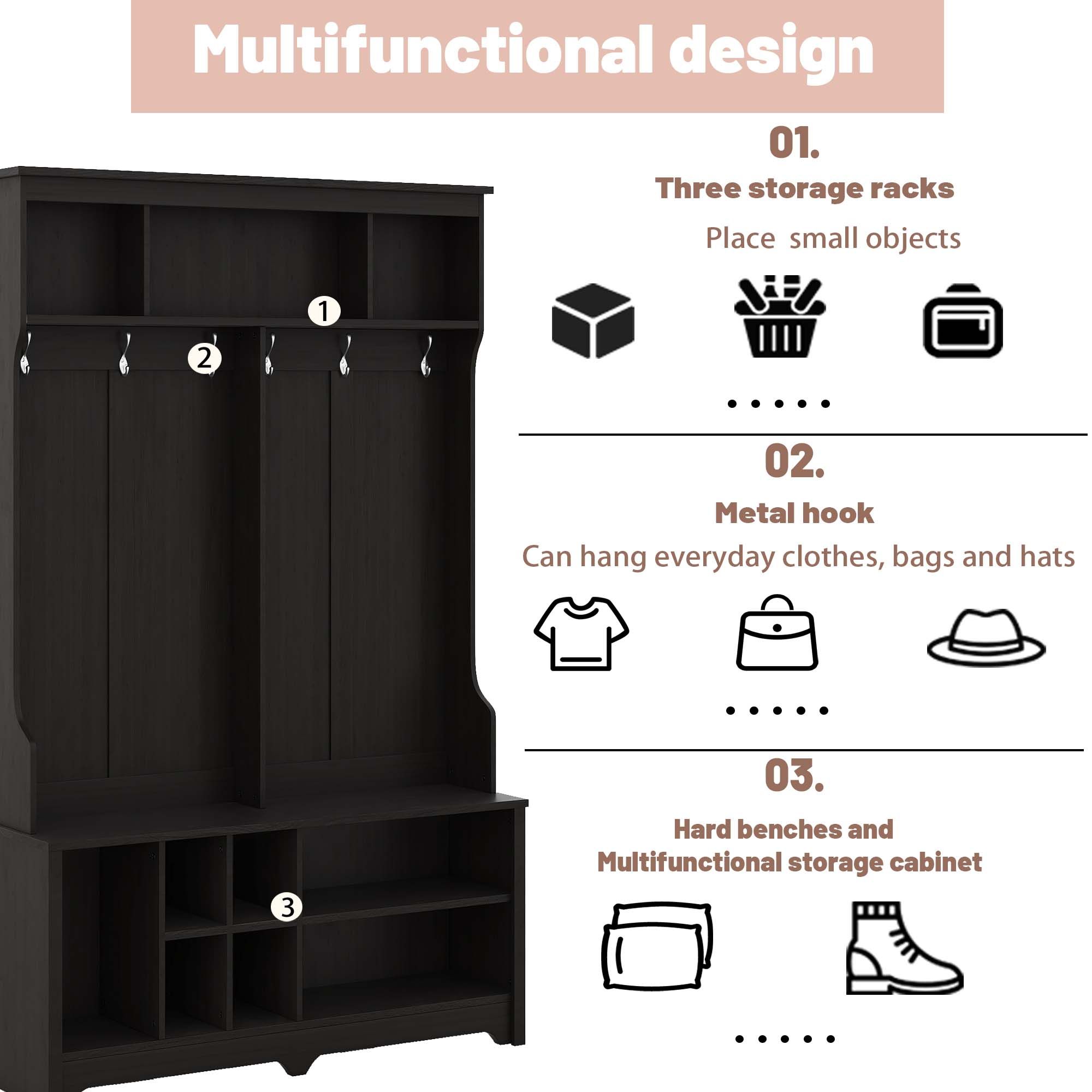 2.Quality Material: Made of MDF and particle board, the hall tree is stable and durable, high-quality materials and exquisite workmanship ensure sturdiness for long-term use.