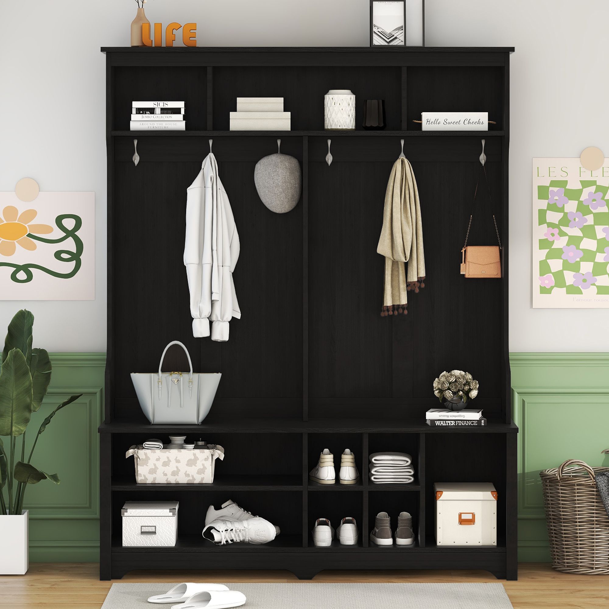 Modern Hallway Hall Tree with Metal Hooks and Storage Space, Multi-Functional Entryway Coat Rack with Shoe Cubbies