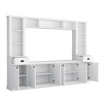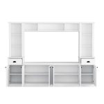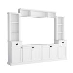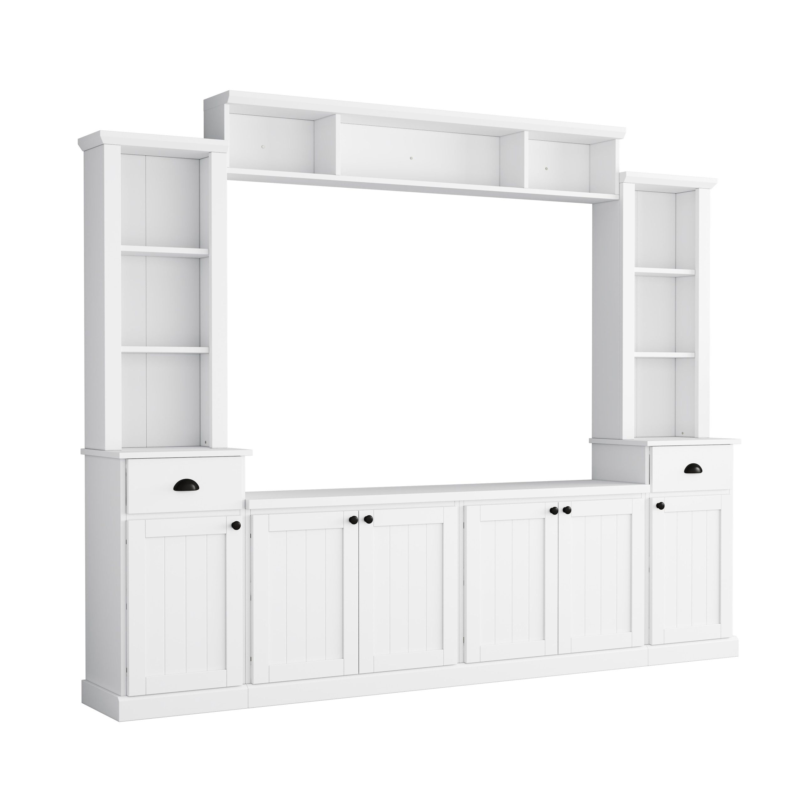 This set of entertainment wall units includes a right pier, left pier, overhead bridge, and TV console. It integrates the features of a TV stand, bookcase, wine rack, and display case in one piece.