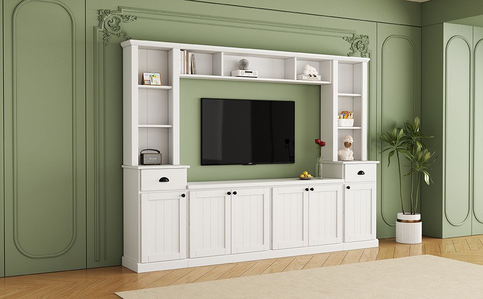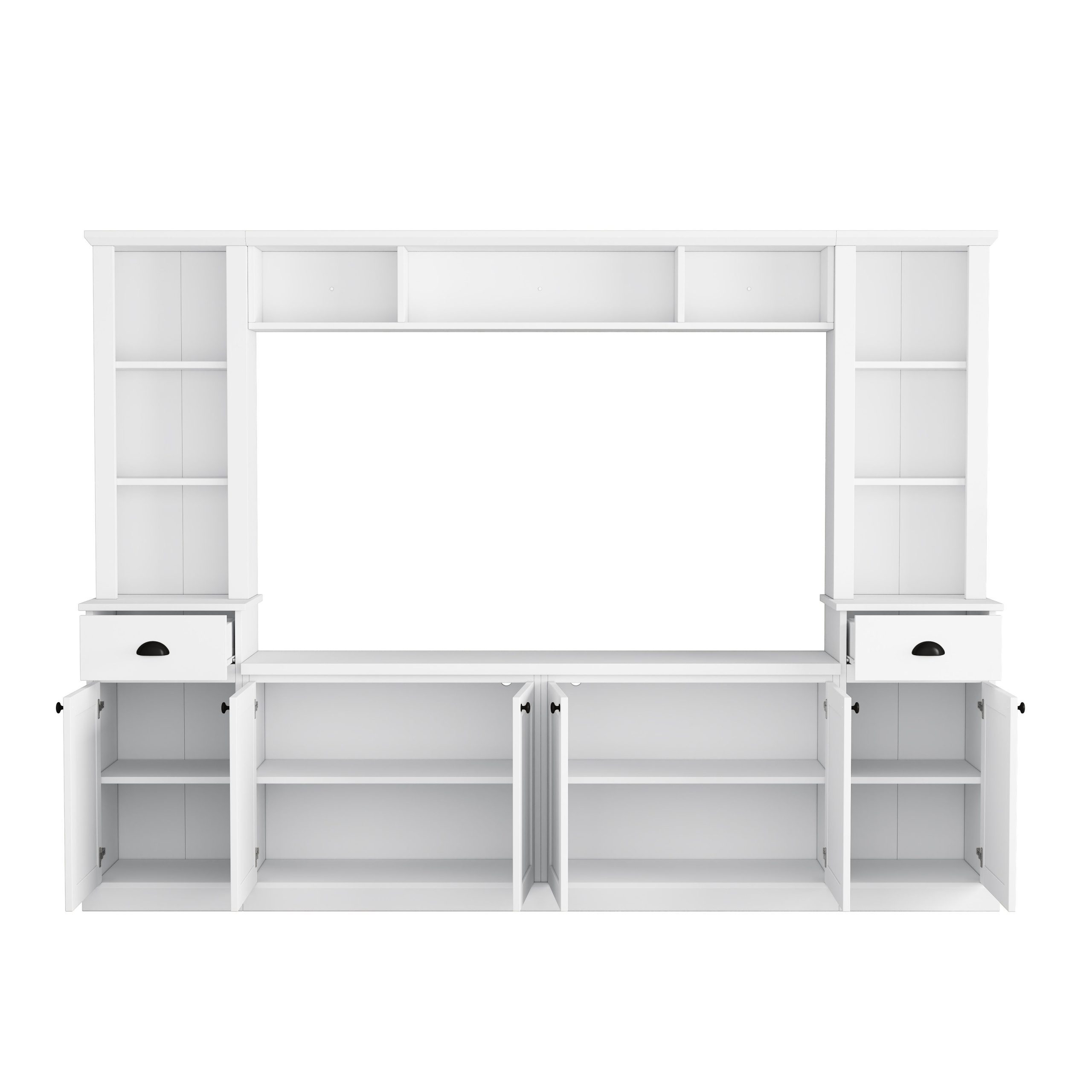 ON-TREND Minimalist Entertainment Wall Unit Set with Bridge for TVs Up to 75'', Ample Storage Space TV Stand with Adjustable Shelves, Modernist Large Media Console for Living Room, White
