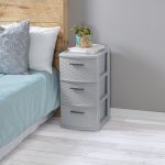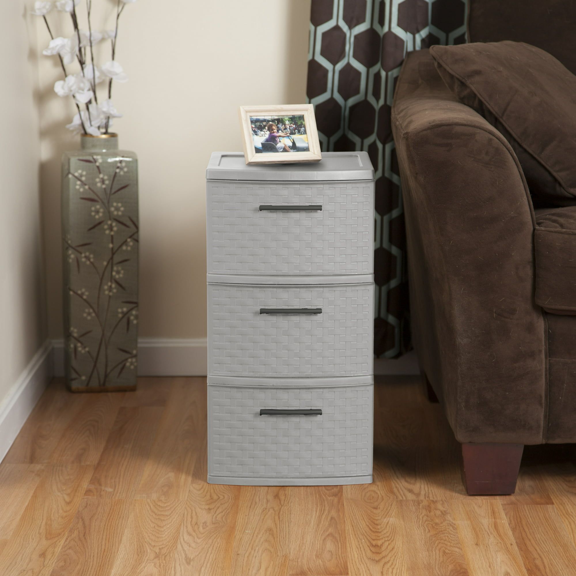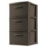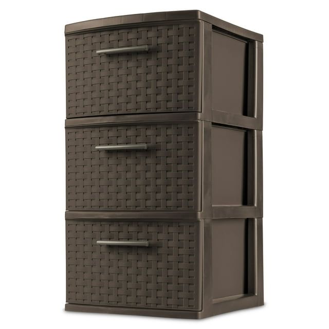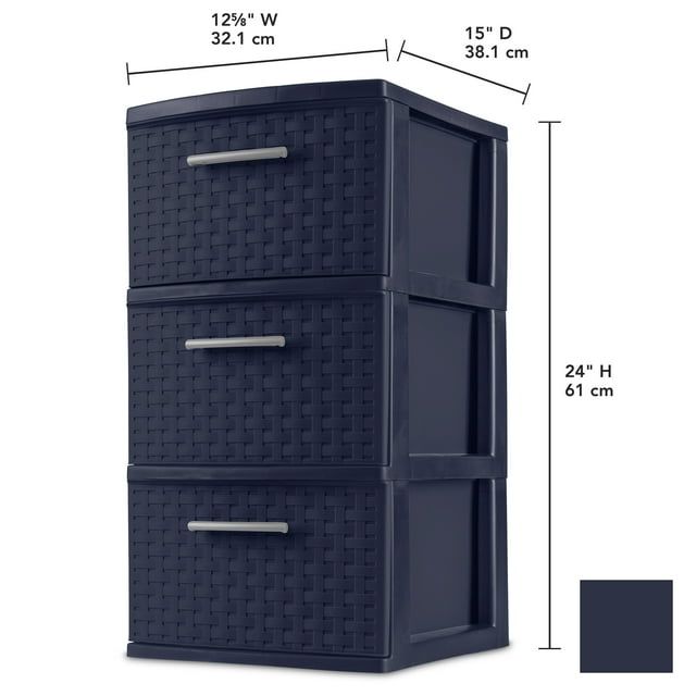 Organize visible storage areas with  Weave collection. These Weave Storage items combine style and function; the trendy look of weave with the convenience, durability and value of plastic to provide a variety of décor solutions for your living spaces. The 3 Drawer Weave Tower is ideal for "out in the open" lightweight storage needs. Three opaque drawers keep clutter controlled and concealed while providing access to frequently used items, where they are most often used. The easy pull handles allow drawers to open and close effortlessly, with a drawer stop to prevent drawers from being removed accidentally. When storing items away, be mindful of the weight in each drawer and don't overload. The overall assembled dimensions of this item are 15" D x 12 5/8" W x 24" H.